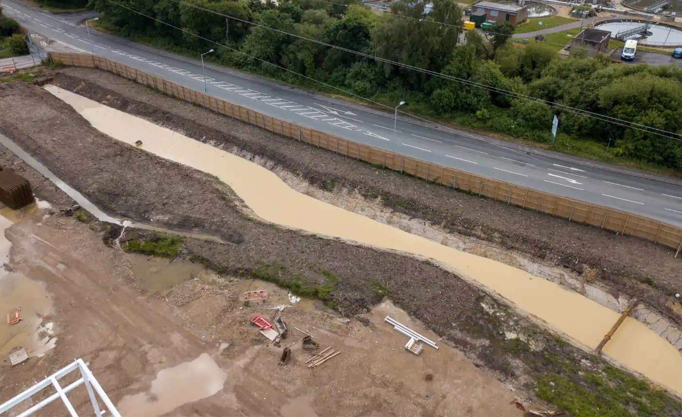 From the outset, the 8.75-acre brownfield site presented immediate obstacles. High-voltage National Grid cables and pylons crisscrossed the land. This restricted heavy machinery use and shaped the whole drainage strategy.