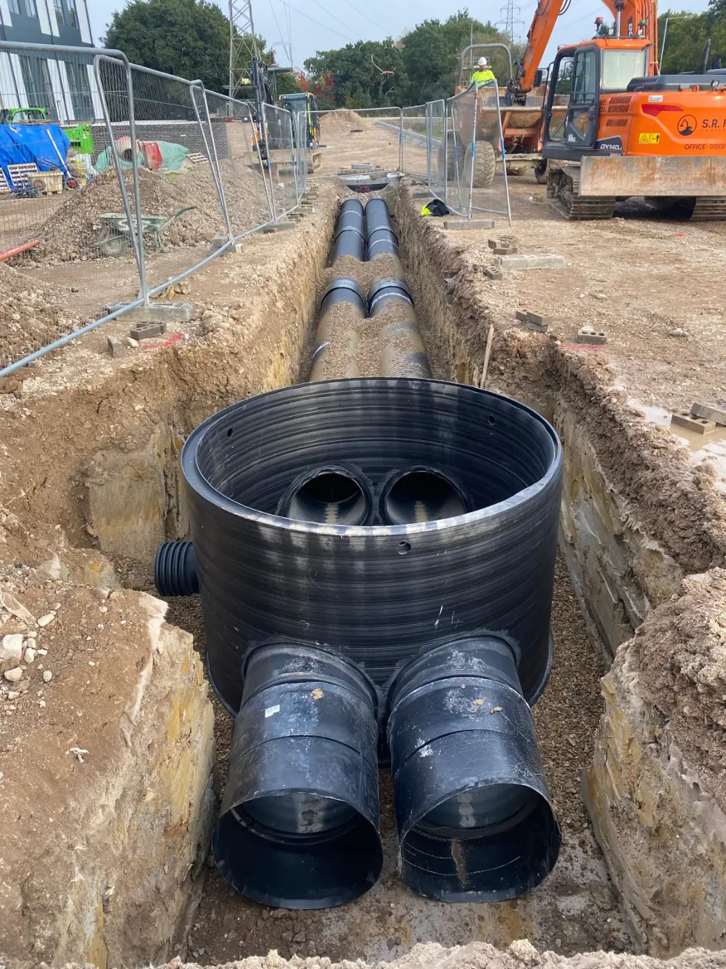 The initial plan featured a large attenuation tank as SuDS required. However, given the position of critical infrastructure, this posed a safety risk. In response, SR France helped redesign the drainage approach. Working with Jade Aden we delivered a large attenuation basin and swale. It was carefully excavated and shaped to ensure flow capacity while steering clear of underground utilities.