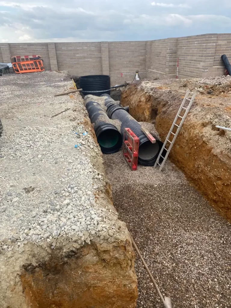 Three 1800mm diameter catch pits, one 1200mm PCC manhole, and a flow chamber were constructed to manage site runoff